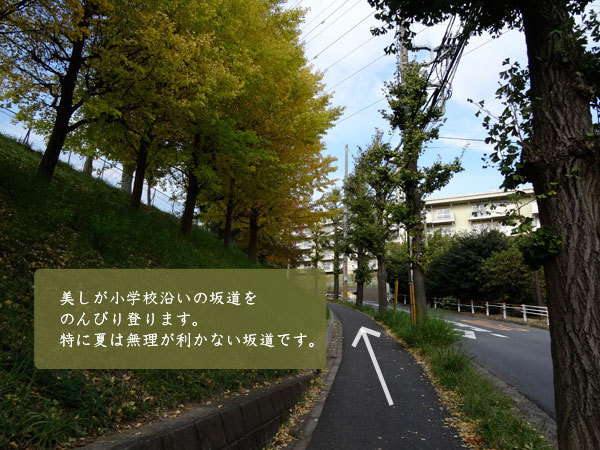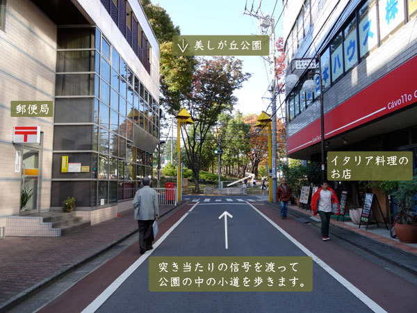 △ まっすぐ進み、信号渡って公園の中を歩きます。