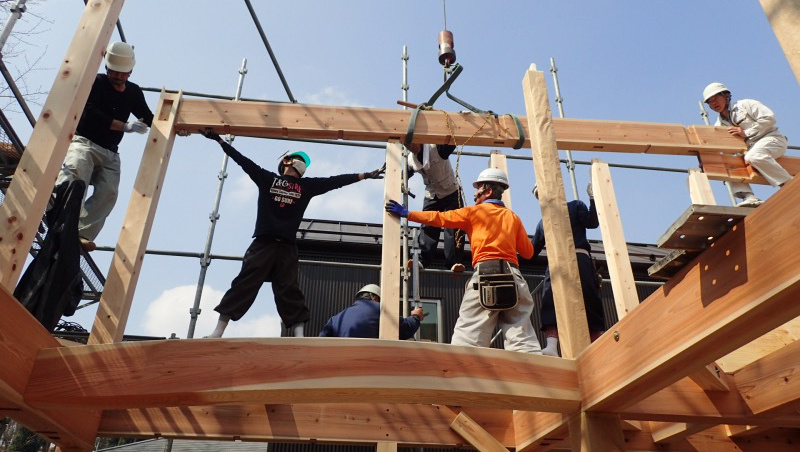 基礎の工事が終わる頃、大工さんに「刻んで」もらった柱や梁をいよいよ現地で組んでいく作業が始まります。